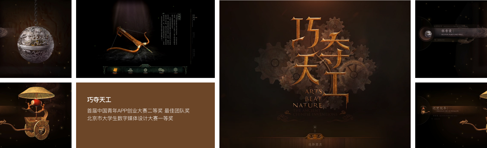 多媒体作品《巧夺天工》是针对大中华文化圈中国传统文化爱好者与世界各地爱好中国传统文化的外国友人的一款教育类中国博物艺术博览平台App。获首届中国青年APP创业大赛二等奖最佳团队奖,北京市大学生数字媒体设计大赛一等奖。