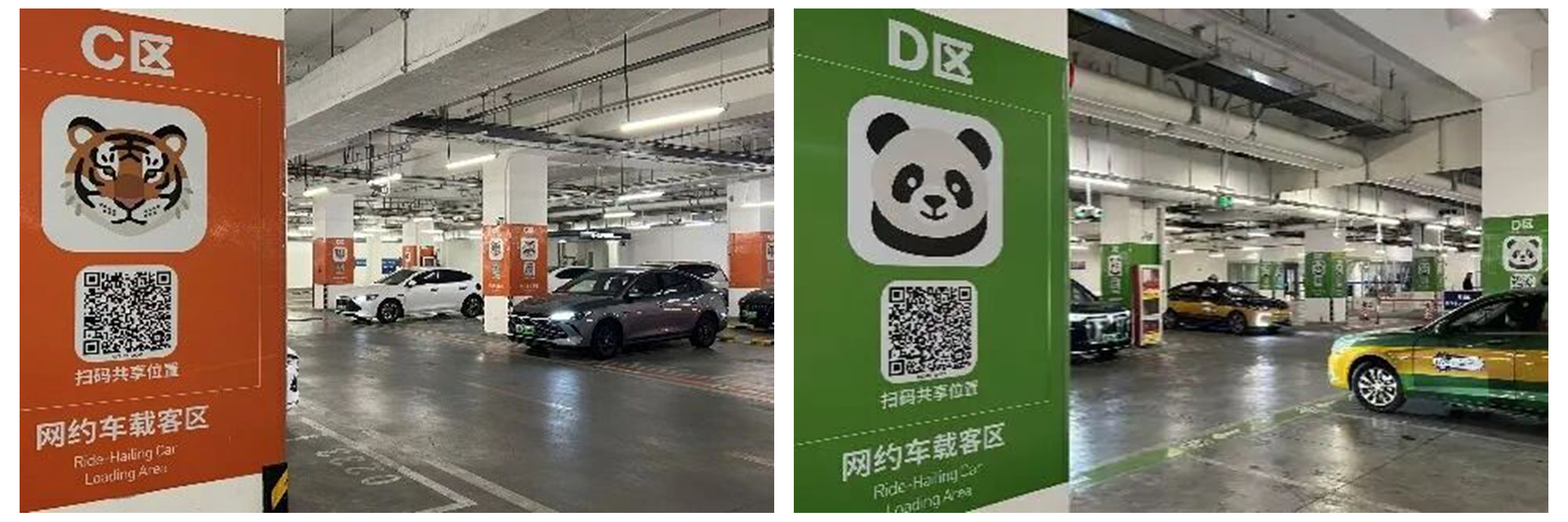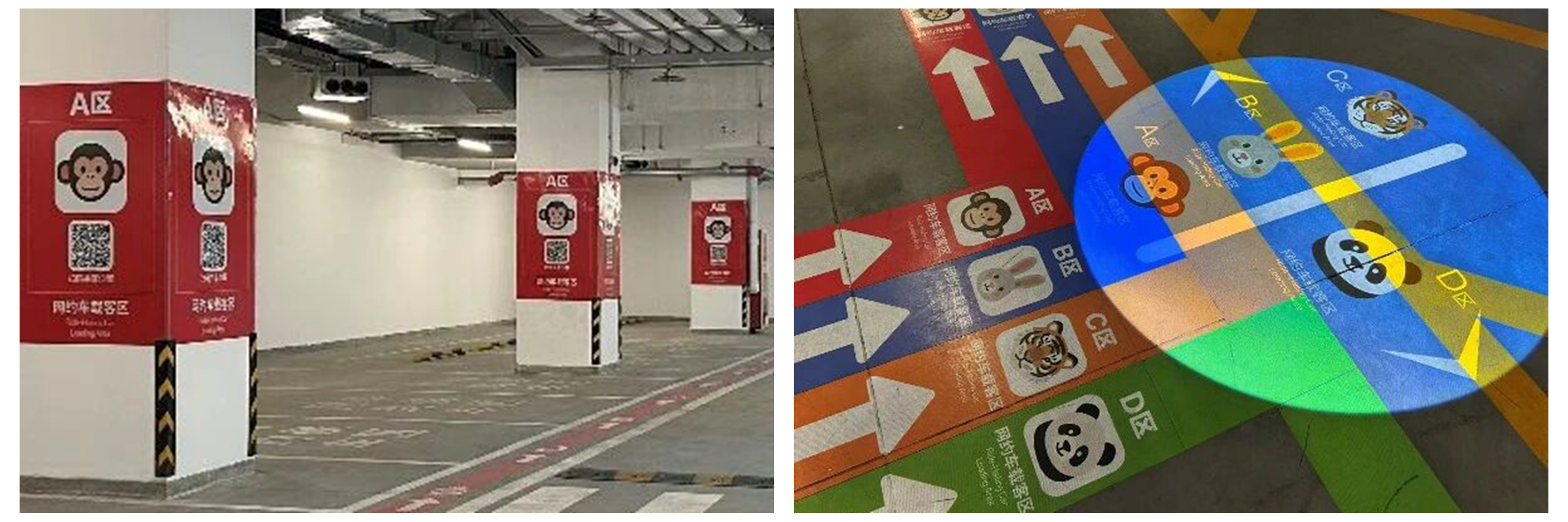该导引系统充分考虑地下停车场光线不足、旅客出行匆忙等实际场景,坚持连续性引导、全天候适用、人性化体验三大设计原则。通过自发光标识、高反光地面贴的组合应用,搭配纯色反光线条、间隔动物图标与彩色汇聚点,确保标识在任何时间、任何光线下都清晰可见;从候客区出口、扶梯口等起点的彩色汇聚点,到全程延伸的反光引导线,再到岔路口的强化指示牌,形成一条连续无缝的指引流线,旅客只需“跟着颜色走”,即可轻松抵达目标分区;分区立柱 360°喷涂主题色、视线最佳高度张贴亚克力动物标识,车道上方悬挂双面吊牌,还贴心设置双语标识与扫码共享位置功能,避免信息过载,兼顾本土与国际化需求,全方位减轻旅客的记忆负担与认知混淆。此外,导引系统选用耐磨、防滑、易清洁的高强度反光乙烯基地贴,实施与后期维护成本低,且反光材质无光污染,不会影响驾驶员视线,在提升指引效率的同时,兼顾了使用的安全性与经济性。