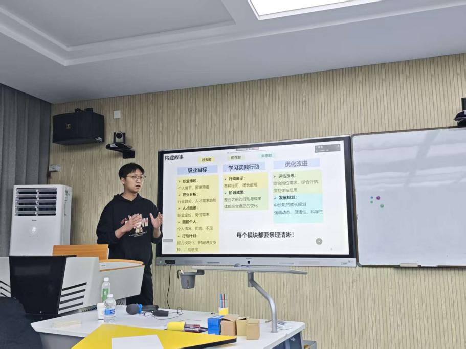培训会上,李天宇围绕大赛评分标准、职业目标设定、学习实践行动、优化改进方向及材料准备等关键环节展开指导。他结合第三届赛事评分细则与第二届的异同进行了分析比对,着重强调了PPT制作的逻辑思路与内容覆盖要点,提醒同学们需确保整体陈述的完整性与逻辑性,清晰展示个人优势与职业发展规划。此外,李天宇还分享了PPT制作中的细节技巧与创新思路,助力同学们优化展示内容。