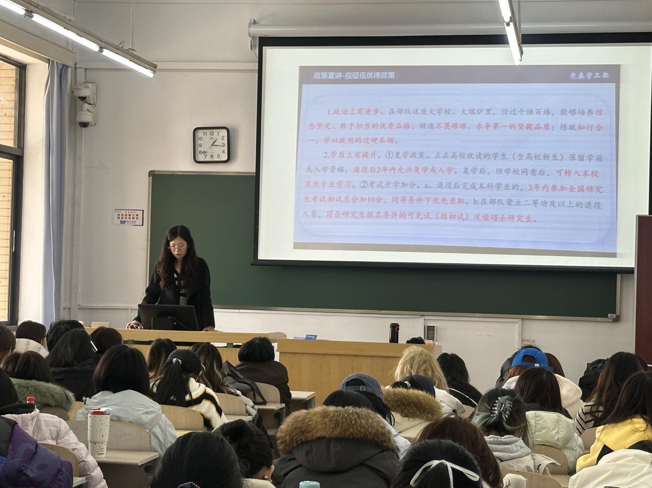 为积极响应国家号召,兰翔深入解读了大学生征兵政策,内容涵盖入伍流程、优待政策及基本条件要求。她从个人成长、能力锻炼、家国情怀等多角度阐述了参军入伍的意义与价值,有效点燃了同学们的报国热情,并鼓励符合条件者积极报名。